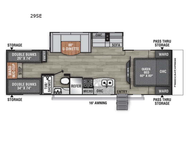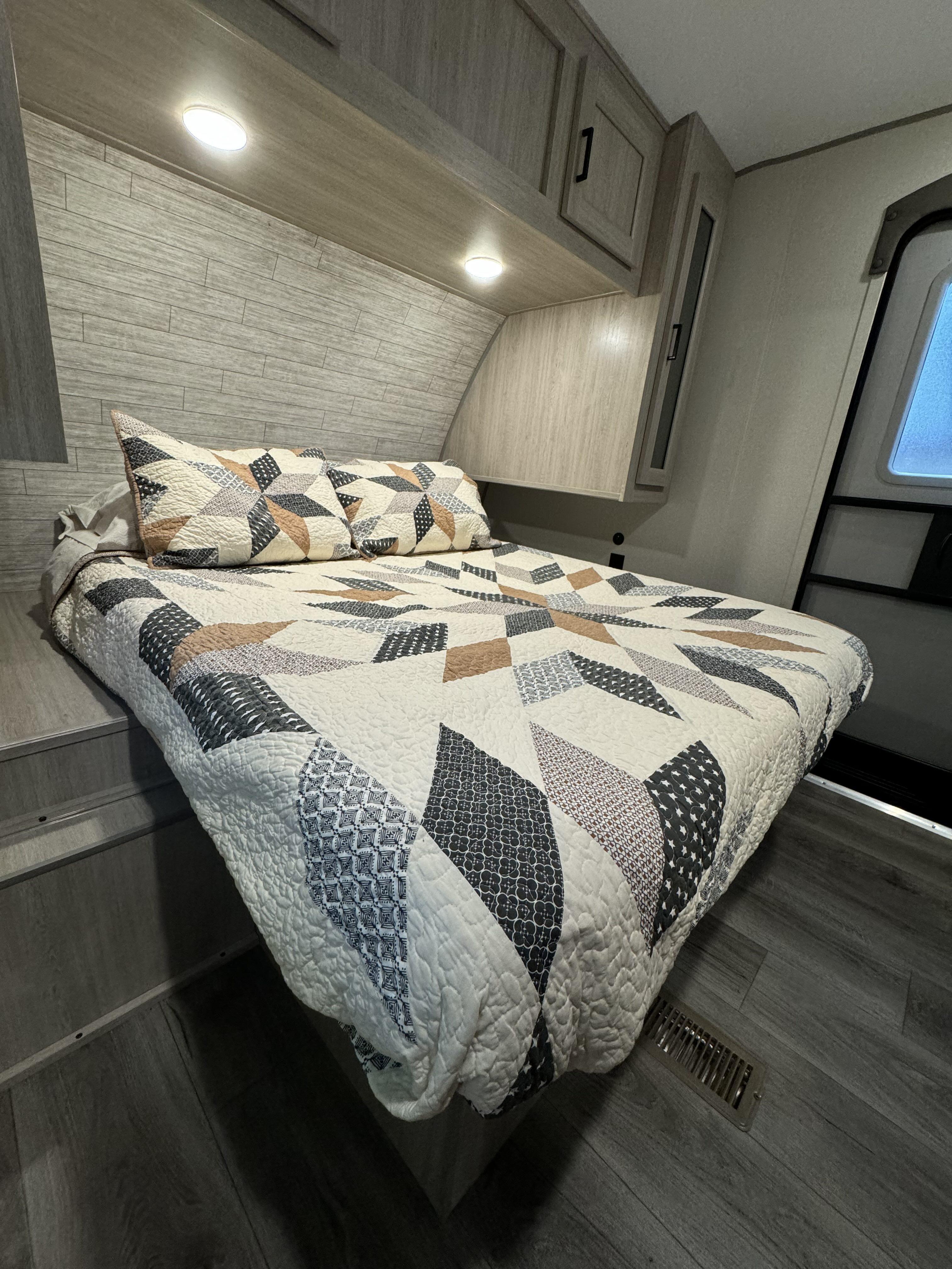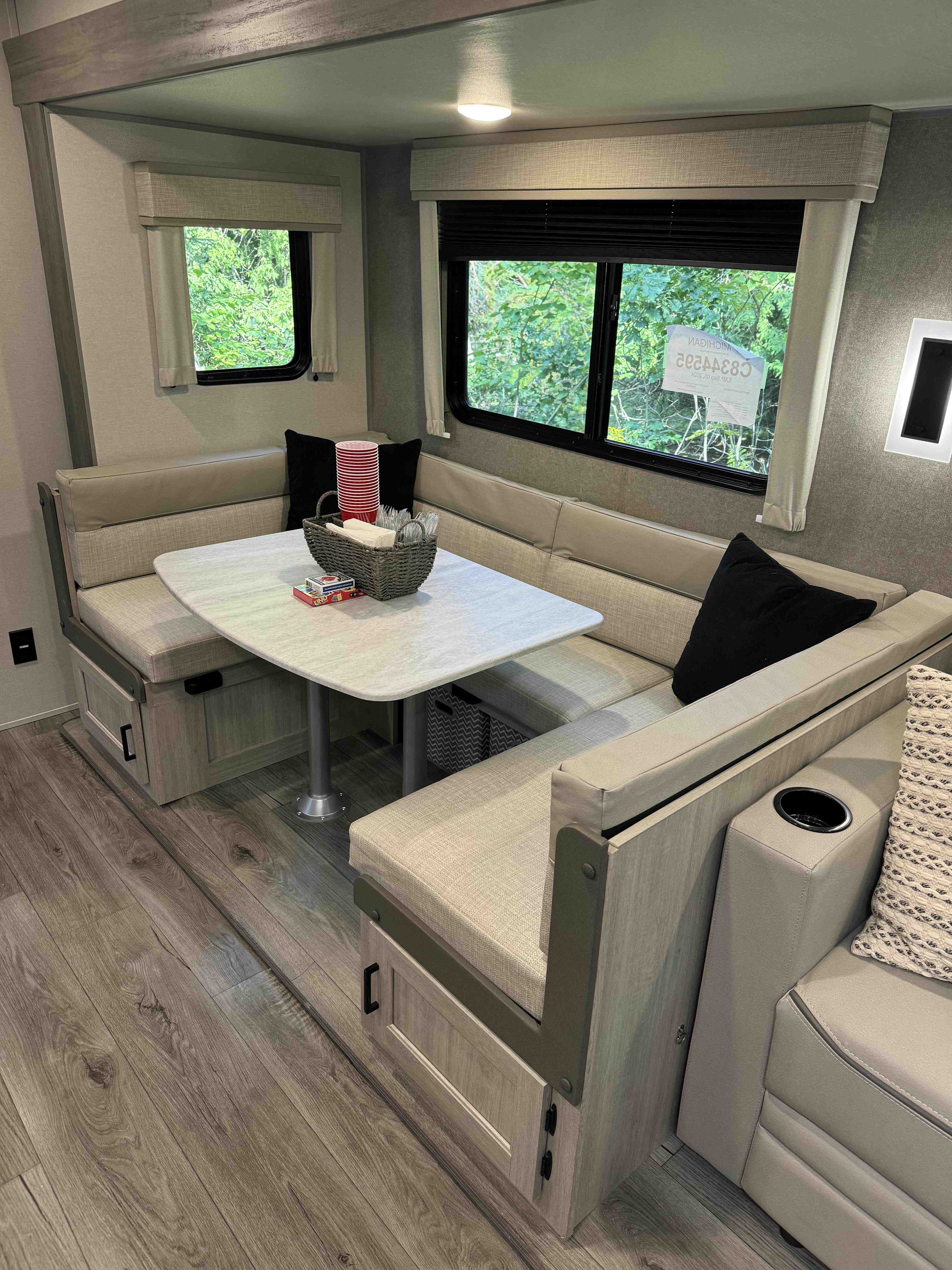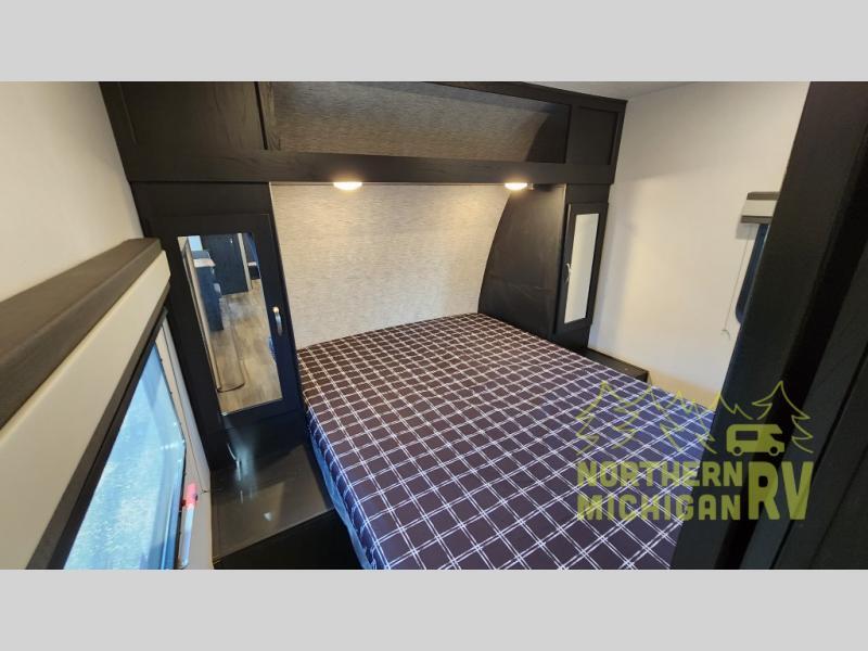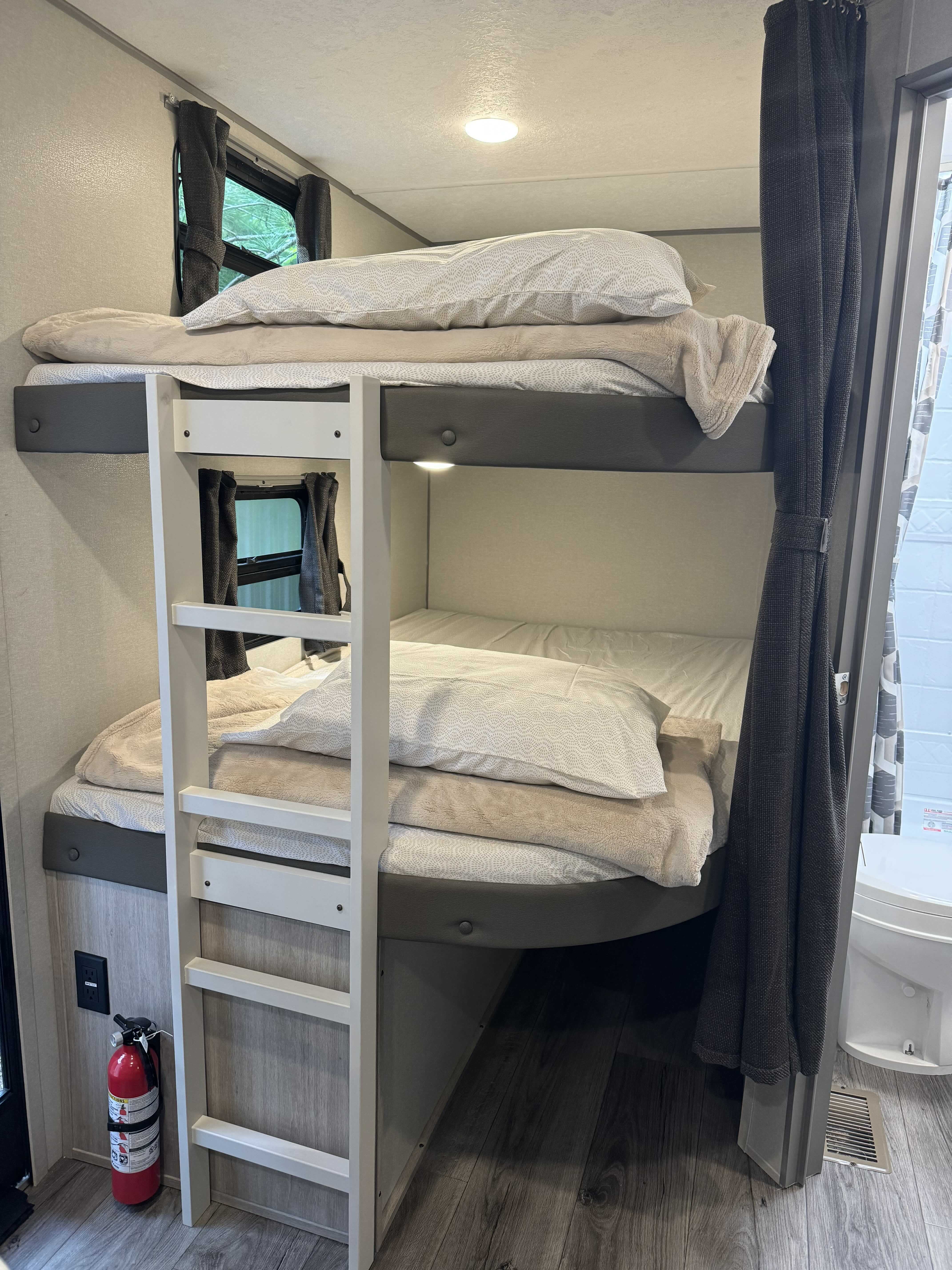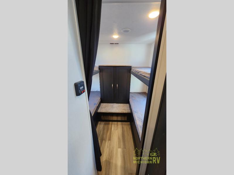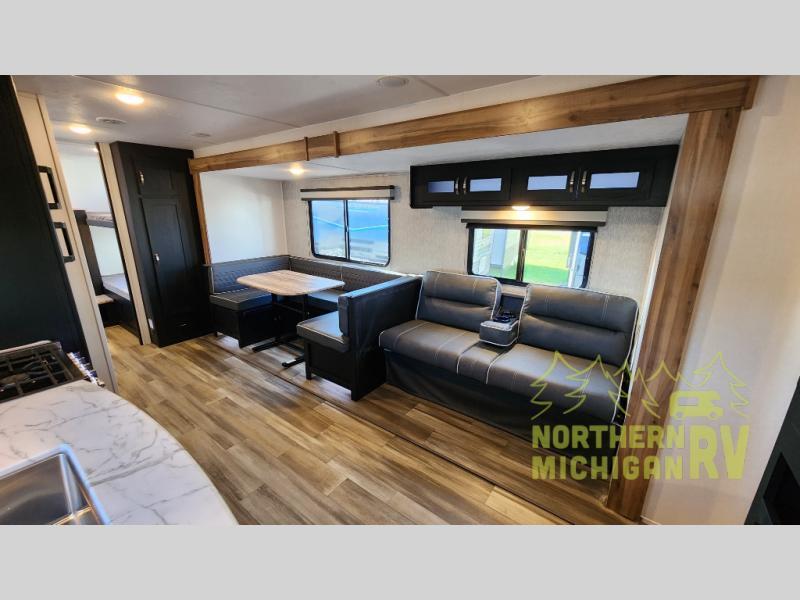 Whole-family fun is waiting for you in this spacious travel trailer. The kids or your guests will love the private bunkhouse with four bunks, plus a wardrobe with a countertop to keep their things. You will enjoy the front private bedroom with a walk-around queen bed and dual wardrobes, and if you have any other guests, they can sleep on the sofa or U-shaped dinette within the large slide out. The kitchen includes everything needed to prepare meals each day, including a microwave oven, a three burner cooktop, and a double door refrigerator.