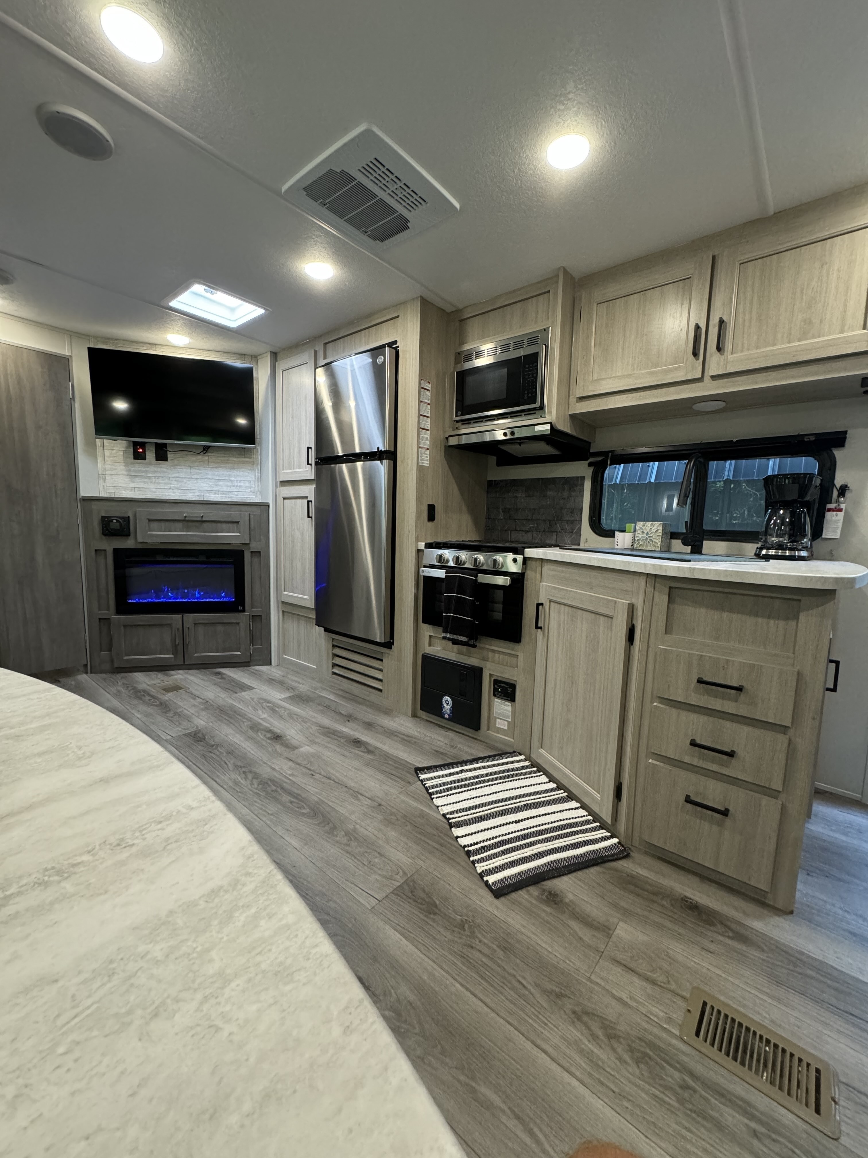 When you enjoy camping with your own accommodations and space for the whole crew, have us hitch this trailer up and head to the campgrounds! With the exterior awning and slideout, there is plenty of indoor and outdoor space to hang out with your family or friends. When you are out camping everyone loves cooking outside, the cook might like to make a meal using the outdoor camper kitchen. The interior kitchen offers full amenities including a pantry, and everyone can enjoy the angled entertainment center. There are double-size bunks with a ladder for the kids and a walk-around queen for the parents to sleep on, plus furniture in the living area that doubles as additional sleeping space!